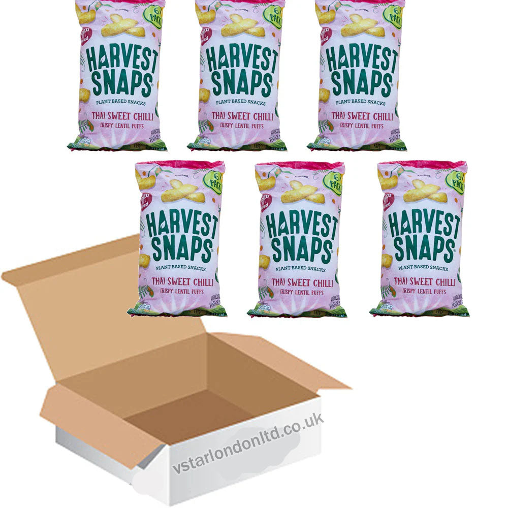 Harvest Snaps Thai Sweet Chilli Crispy Lentil Puffs are a light and crunchy snack made from 58% red lentils, seasoned with a bold Thai sweet chilli flavor. Each 18g bag contains just 80 calories, making them a healthier alternative to traditional fried snacks. They're baked, not fried, and are a good source of plant-based protein and fiber. These puffs are gluten-free and suitable for both vegetarians and vegans. Each box includes six 18g bags, perfect for on-the-go snacking or lunchboxes